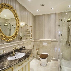 Использование изящной и в то же время добротной мебели лаконичных форм делает ванные комнаты в классическом стиле легко узнаваемыми. Такой интерьер тяжело представить без красивого туалетного столика с массивной мраморной столешницей и изысканной фурнитурой, а также зеркала в золоченой раме.