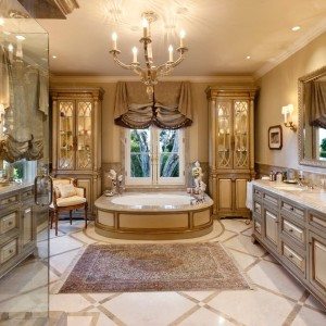 Благодаря использованию определенных дизайнерских решений, ванная в данном стиле навевает мысли о давно минувших временах, когда подобные интерьеры служили роскошными декорациями сцен омовения королей или же изнеженных красавиц.