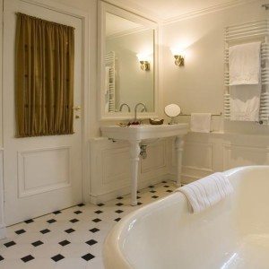 - Ванна с изогнутыми «старинными» ножками или экран, закрывающий ее низ и драпированный «под дерево» с такими же коваными деталями, гарантируют эффект стиля.