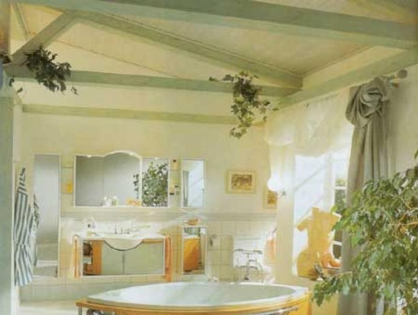 - Потолок классический – побеленный, или декорированный балками (можно их имитацией). По своему цвету, потолок отражает пол, поэтому необходимы более светлые варианты оттенков пола в ванной комнате и стен.