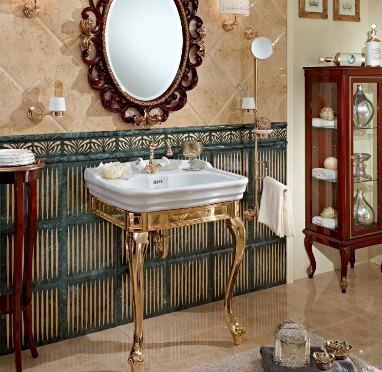 Раковины для ванной этого стиля пристенно-напольного монтажа с консолью и металлическими ножками, настенного монтажа с литым массивным металлическим основанием, похожим на чугунное литье, напольного – с ножками их фаянса,выложенные роскошной мозаикой Sicis (Сичис).