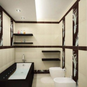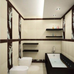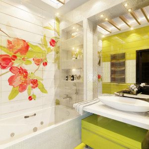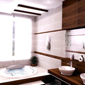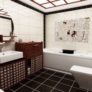 Одним из самых практичных вариантов для отделки пола в ванной комнате и стен в ванных считается керамическая плитка. Стена, стилизованная под натуральные материалы – солому, бамбук или дерево – будет смотреться весьма эффектно. Строительный рынок предлагает покупателям обширный ассортимент керамической плитки.