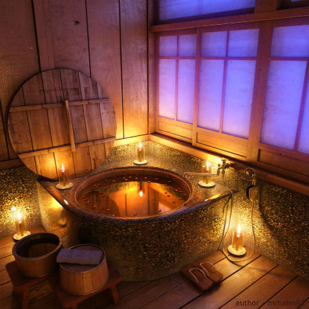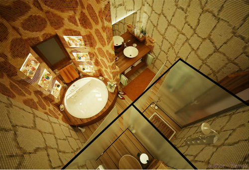 В зоне ванны, на натяжном полотне расположить квадратные светильники, игра света которых создаст завораживающую атмосферу. А возле зеркала, на стене закрепить светильники, имитирующие ковку.
