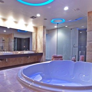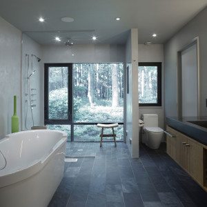Мы приветствуем современный подход относительно того, что в частном доме ванная комната может быть где угодно. А лучшим местом для нее считается соседство со спальней хозяев.