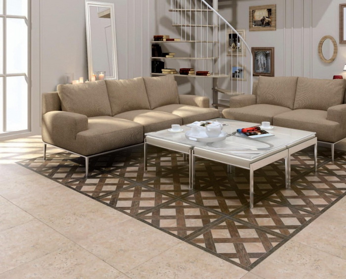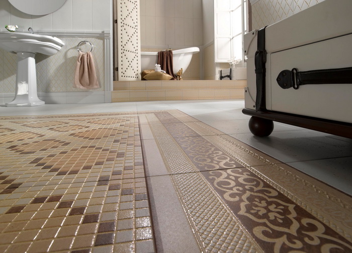 Керамическую плитку традиционно используют для пола в кухонной зоне, прихожих и ванных комнатах. Красивый прочный и экологичный материал, идеальное покрытие для «мокрых» зон, прост в уходе, но может быть скользким, сложен в укладке.