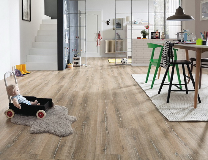 Кварцвиниловая плитка — это нечто среднее между линолеумом и ламинатом. Способ укладки как у ламината. Состав – это пвх плюс ещё масса всяких добавок, ракушечник и речной песок в том числе. Материал прочный, плотный и гибкий, абсолютно не боится влаги, можно использовать в «мокрых» зонах. Экологичный и безопасный. Могут возникнуть сложности при укладке, не рекомендуют клеить на цементное основание, требует хорошо выровненных поверхностей.