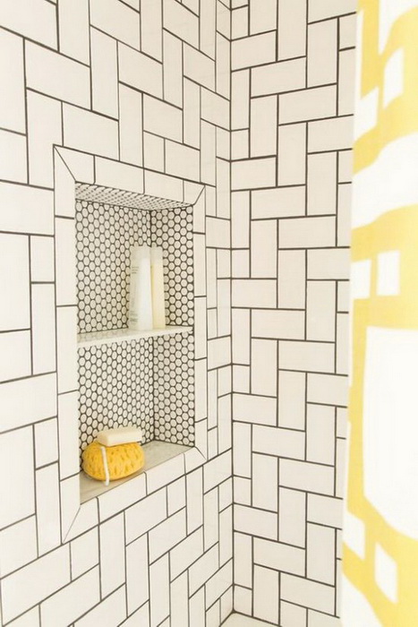 Расшивать швы в тон кафеля — распространенный ход, но в то же время и скучный. Намного интереснее смотрятся цветные и контрастные. Главное, сделать все аккуратно и точно. Белая плитка с черной затиркой придает строгости интерьеру и надолго сохраняет свежесть ремонта. Яркие тона швов создадут настроение в помещении, но они менее практичны, так как быстрее пачкаются и требуют более тщательного ухода.