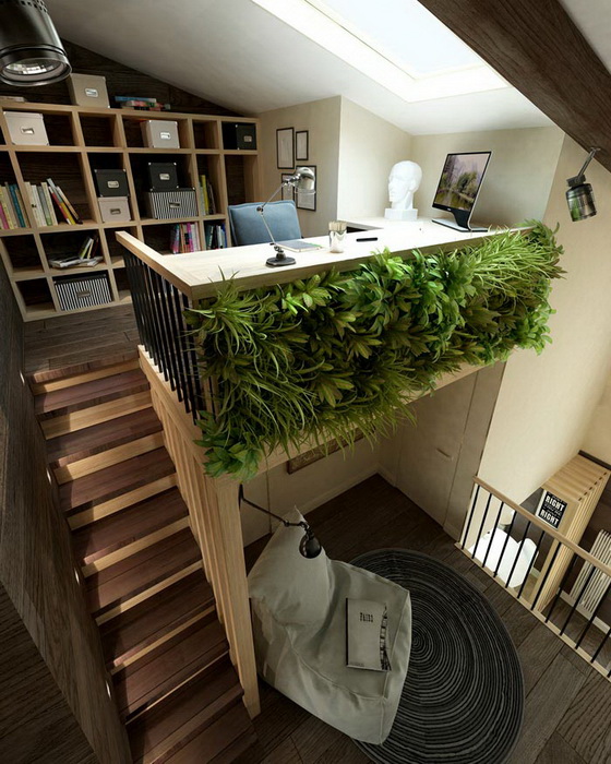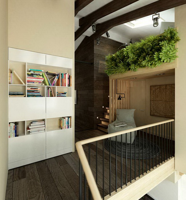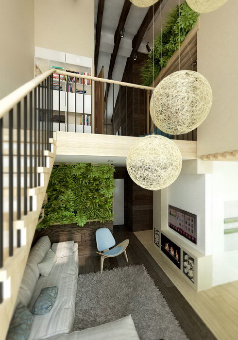Эта двухуровневая квартира примечательна не только стильным и уютным дизайном и интерьера, но и оригинальным способом озеленения. Для оформления жилища было использовано максимальное количество натуральных материалов. Мебель из светлого дерева, обилие текстиля, столик из пня и многое другое насыщают комнату благоприятной органической атмосферой. Но основным акцентным пятном в квартире, оформленной в теплой, спокойной цветовой гамме, стали участки вертикального озеленения, расположенные на первом и втором этажах.