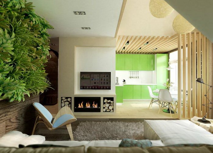 Зеленая стена эффектно подчеркивает остальное интерьерное решение. Мебель в спокойных светлых тонах наиболее выгодно смотрится рядом с зеленым оазисом. Пушистый светло-серый ковер напоминает траву, чем продолжает тему экологии. Панели из темного дерева выгодно играют на контрасте использованной цветовой палитры. Искусственный камин дополнен натуральными поленьями, что приближает огонь к настоящему. Кухня выполнена в салатовом цвете, и вторит природной обстановке.