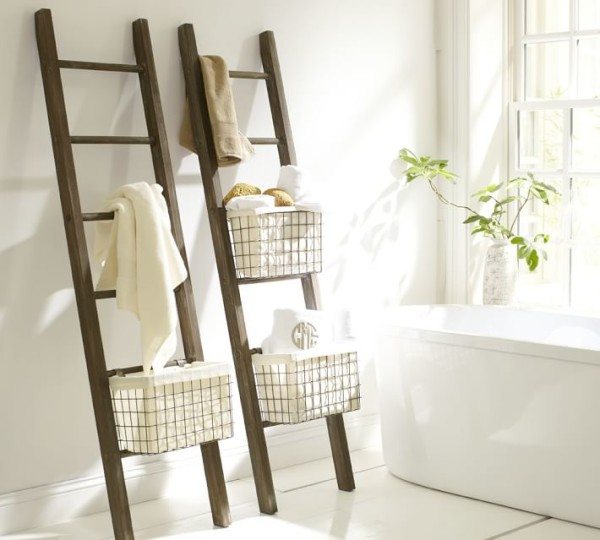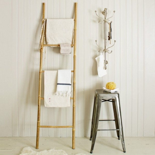 Большое количество перекладин позволяет сушить несколько полотенец одновременно. К тому же, стремянку можно покрасить и украсить дополнительными аксессуарами, чтобы дополнить имеющийся интерьер.