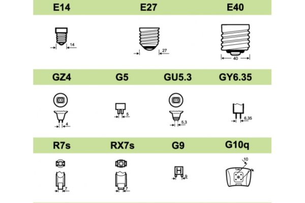 - Лампы накаливания и светодиодные чаще используют резьбовые цоколи (Е14, Е27, Е40).