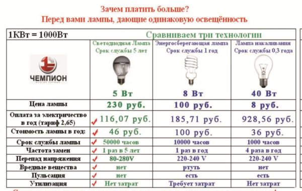 Камрады, я обеими руками голосую за светодиоды. Причина довольно очевидна: они являются самым экономичным источником света. Вот сравнительная таблица светоотдачи на ватт потребляемой мощности: