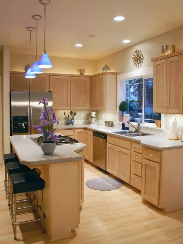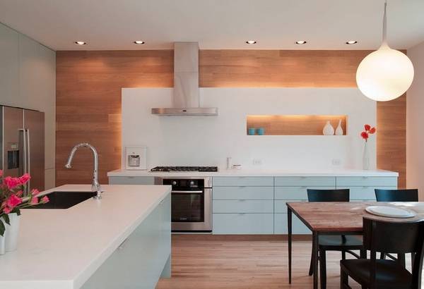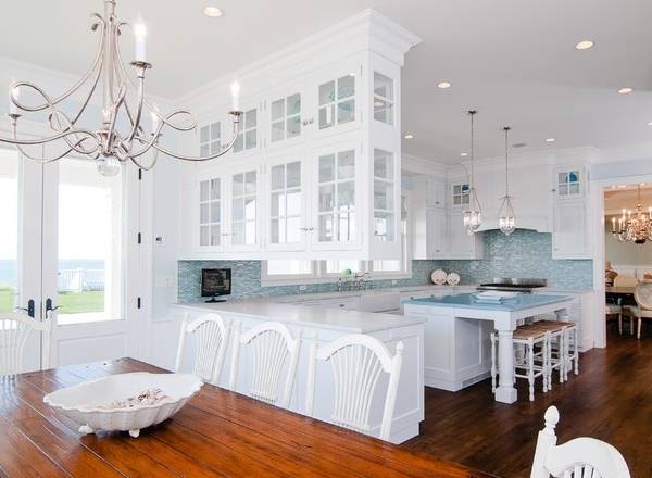 Либо можно выполнить в фартук на кухне в голубом цвете. В таком случае будет довольно несложно управлять количеством цвета, просто выбрав фартук из множества различных конфигураций. Подобный подход даёт возможность полностью контролировать результат, что получится на выходе после проведения ремонтных работ.