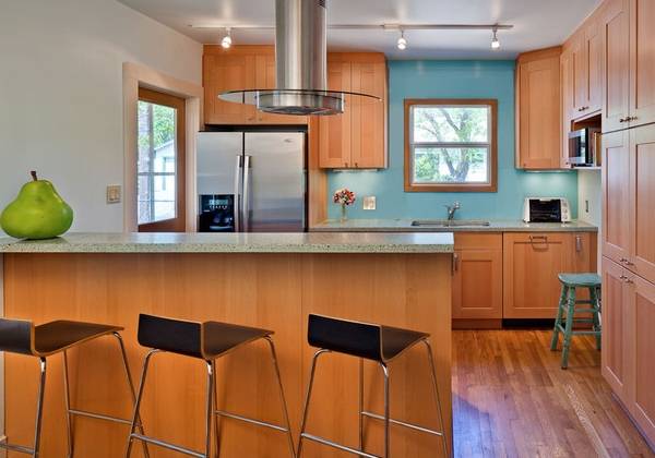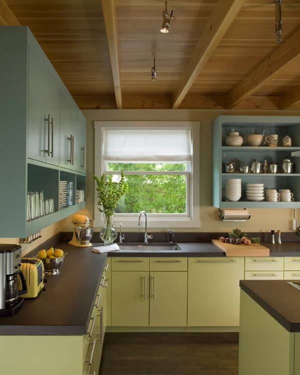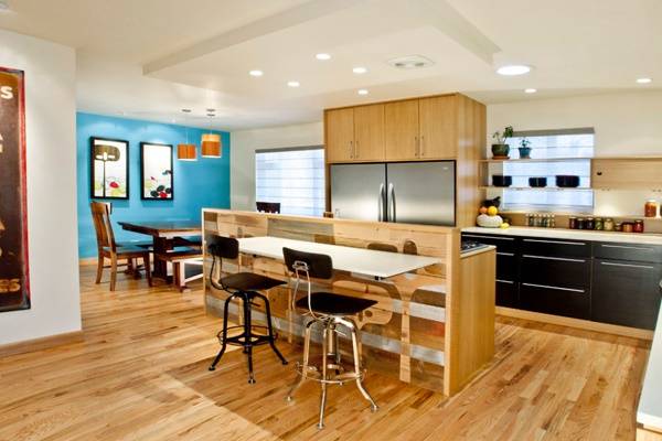 Другим вариантом применения голубого в дизайне интерьера является мебель. Диваны, кухни, шкафы и другие крупногабаритные предметы голубого цвета просто шикарно сочетаются с деревянными полами, столешницами и прочими изделиями из дерева. А в качестве фона для них дизайнеры часто выбирают белый, жёлтый и коралловый тона.