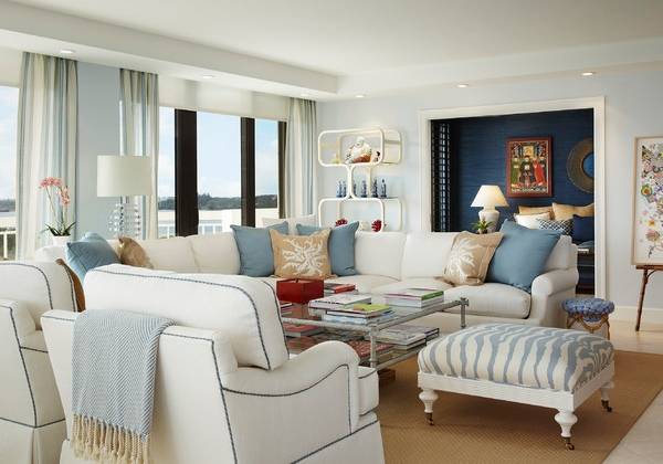 Стоит обратить отдельное внимание на сочетание голубого цвета с бежевыми, светло-желтыми и золотистыми тонами. Как море и песок, комбинация этих оттенков является идеальной парой. Да и пляжный стиль сегодня в моде.