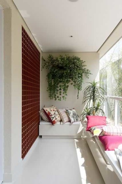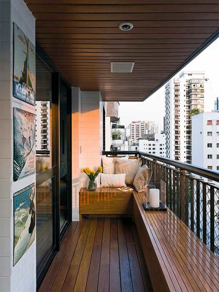 Сначала об оформлении балкона, который используется по назначению: для приятного отдыха почти на свежем воздухе. Даже открытый балкон подойдет для этой цели. Представленная на фото отделка балкона внутри не является какой-то супер-сложной или дорогой, но идея отличная. Потолок, пол и низкие длинные ящики по всему периметру сделаны из вагонки. Покрашены, скорее всего, маслом с пигментом. Несколько подушек или мягких матов превратят это место в отличный уголок для расслабления.