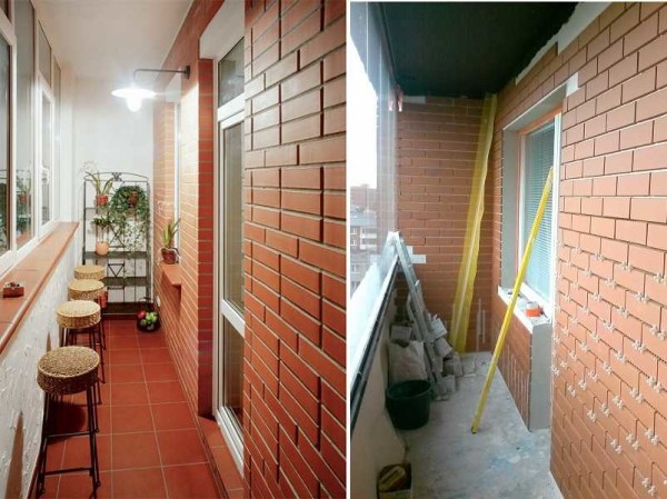 При таком подходе отделка балкона внутри должна перекликаться с оформление кухни. Неплохо смотрится отделка под кирпич в сочетании с гладкими стенами из гипсокартона.