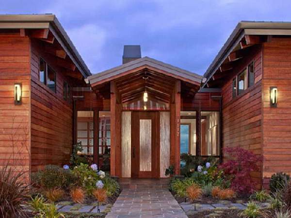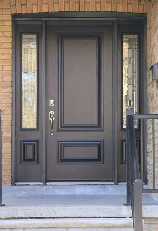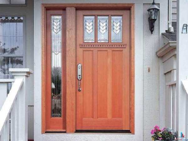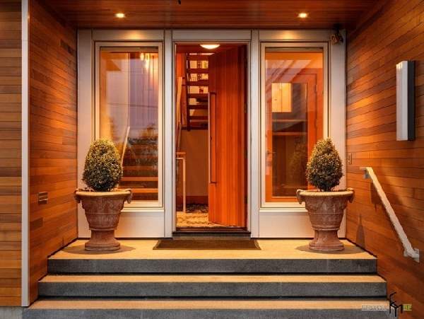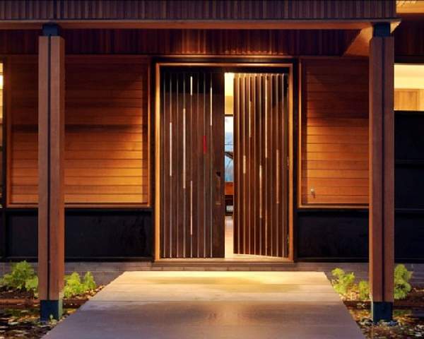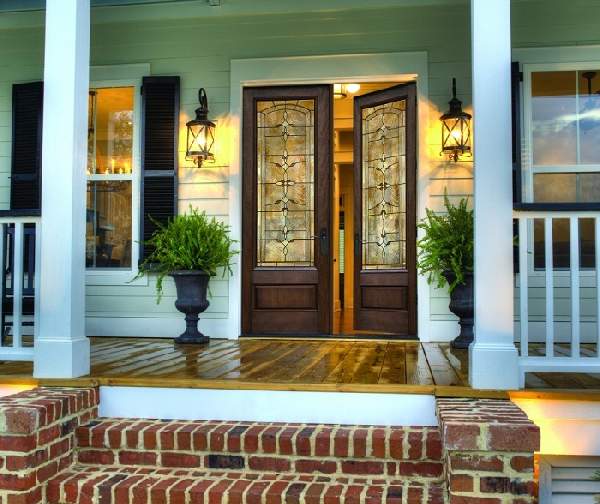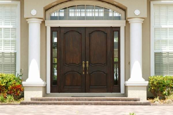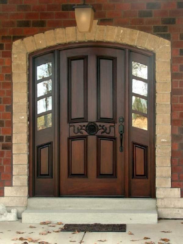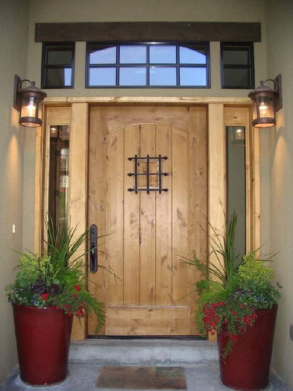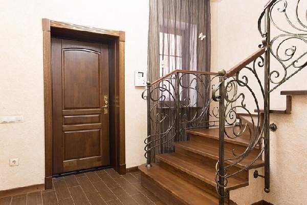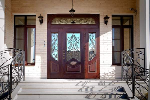 В отличие от дверей квартир, расположенных в многоэтажных домах, деревянные входные двери для частного дома должны иметь наиболее качественные характеристики. Они больше всего подвержены воздействию природных явлений таких как ветер, осадки и перепады температур. Для сложных климатических условий, можно приобрести трехщитовые деревянные входные двери из массива. Такие двери наиболее надежные долговечные и привлекательны (их фото можно увидеть в нашей статье). Если над входом отсутствует козырек, приобретение затворов, облицованных влагонепроницаемой фанерой станет лучшим вариантом. И, конечно стоит учесть стиль фасада здания.