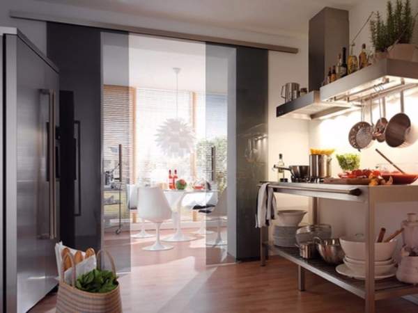 Однако, существуют и некоторые недостатки установки двери купе на кухню. Одним из них является плохая изоляция, касающаяся не только звуков и тепла, но и запахов. Ведь зачастую такая дверь не прилегает плотно к дверном проему. Альтернативным вариантом в таком случае становится установка раздвижной двери, которая будет въезжать в стену (см. пример на фото ниже).