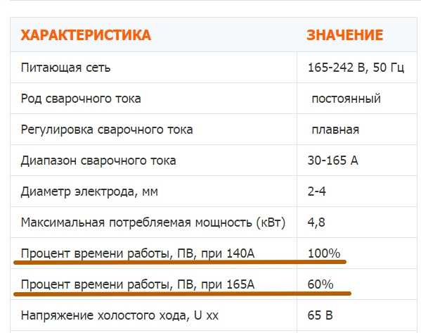 Например,  если в характеристике стоит ПВ на максимальном токе 40%, это значит, что из 10 минут 4 вы можете варить, а 6 будете ждать, пока аппарат остынет. Нормальными характеристиками считаются хотя-бы 50-60%, хорошими — 70% и выше.