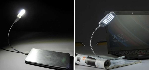Кроме всех описанный выше вариантов, для компьютера или ноутбука можно использовать лампы, которые подключаются не к сети 220 В, а к USB-порту. Если у вас стоит USB-расширитель/удлинитель, ЮСБ настольная лампа для рабочего стола может подключаться к нему. Также ее можно подключить к соответствующему выходу на ноутбуке. Есть такой же выход и на системном блоке, но стоит он обычно под столом, а освещать там нечего, поэтому и нужен USB-удлинитель.
