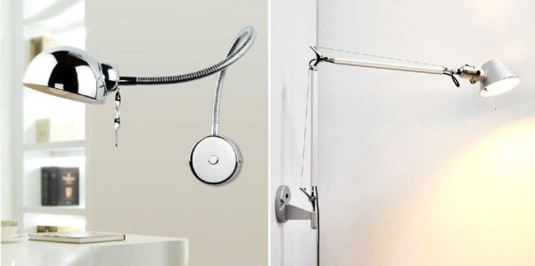 • Настенное крепление. Самая малочисленная группа, но не самая плохая. Если стол обычно занят, лучше светильник прикрепить к стене — он точно будет в безопасности. Это не самый популярный вариант, возможно потому, что перенести настольную лампу с таким типом крепления —  проблема.