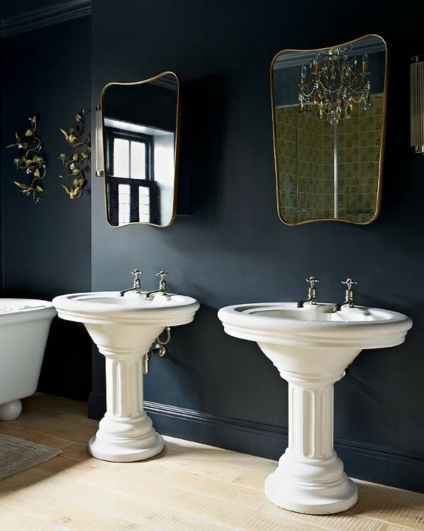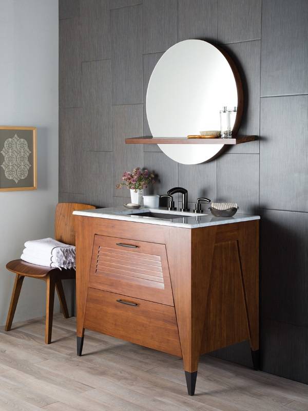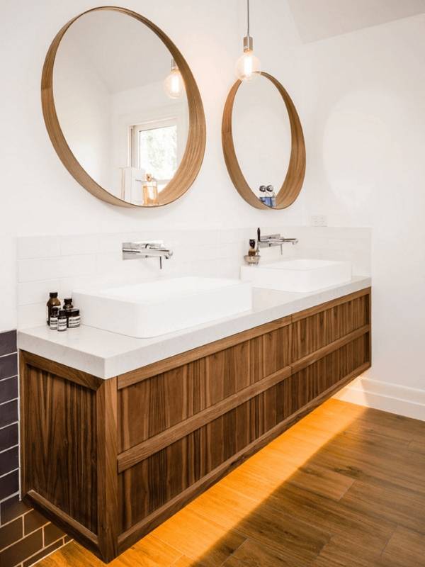 А вот современный стиль интерьера ванной лучше всего дополняют простые, но широкие оправы зеркал под цвет столешницы, тумбы или других деталей обстановки.