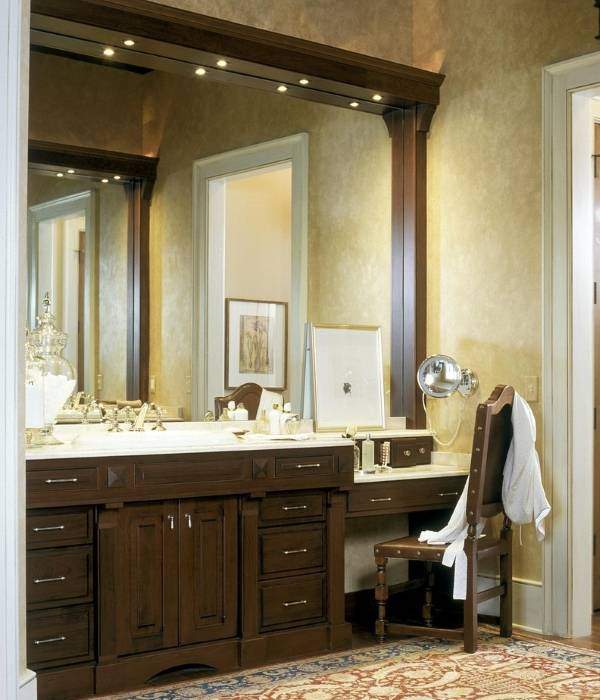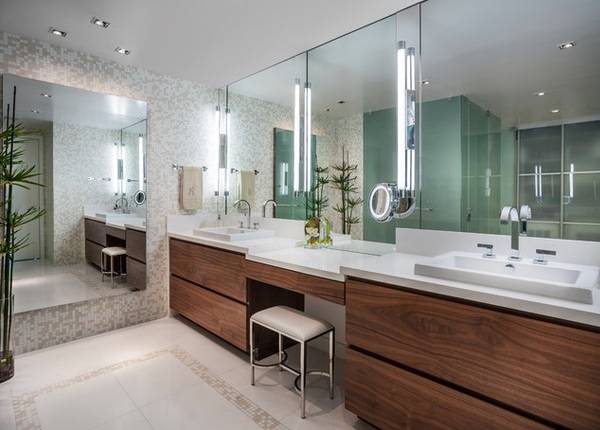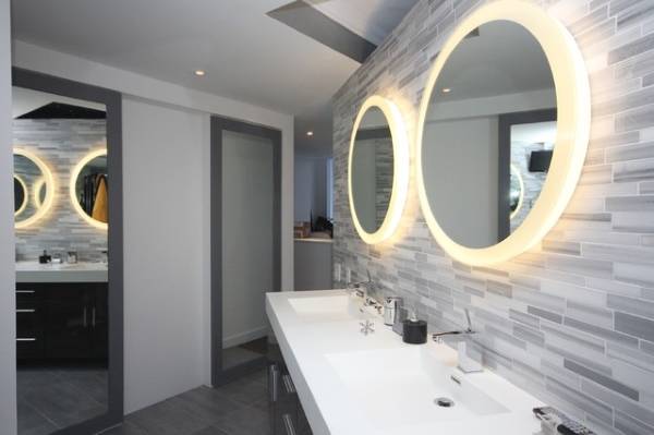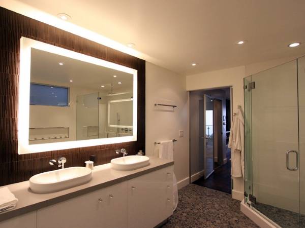 Одним из главных на сегодня трендов в дизайне ванной комнаты является использование блока «зеркало + тумба под умывальник» в качестве туалетного столика. Если вы тоже не можете устоять перед этим вариантом, тогда покупайте зеркало с подсветкой в ванную комнату. Она не только позволит вам лучше видеть себя, но и будет служить источником романтической атмосферы для наслаждения отдыхом в ванной (тогда как яркий верхний свет отнюдь не способствует расслаблению в духе спа).