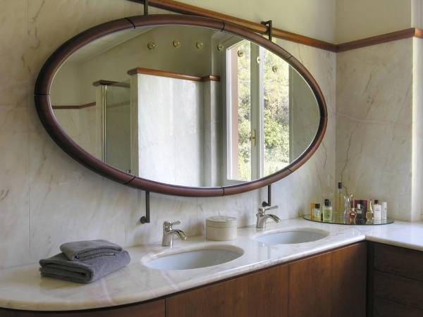 В данном вопросе главную роль играет дизайн интерьера ванной и её линии. В простой и спокойной обстановке изысканно украшенное зеркало может служить элементом роскоши. А вот в комнате, где и без того много мелких деталей, лучше всего будет смотреться простое овальное или прямоугольное зеркало. Материал и цвет рамы следует подбирать под мебельную фурнитуру или другие детали ванной.