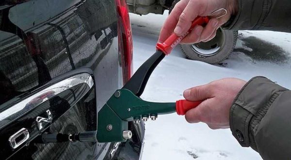 Работа заклепочника при установке вытяжных заклепок