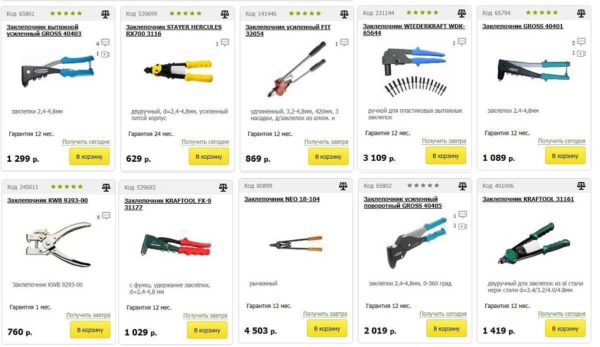 При выборе конкретной модели многие опираются на цены. Вот только разброс очень большой — есть очень дешевые и, практически один в один по внешнему виду, но в разы дороже. Даже в десятки раз дороже. Сразу стоит сказать, что даже для разовых работ, покупать совсем дешевый заклепочник — слишком рисковать. Он может совсем не работать или работать через пень-колоду.
