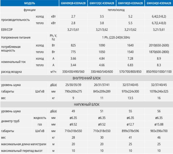 Пример технических характеристик сплит систем