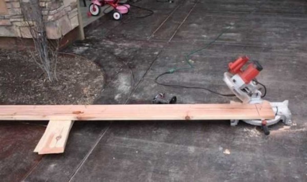 Нижний конец бруска или доски нужно заострить — так проще будет забивать ограждение в землю. Затем берем стусло или дисковую пилу, и отрезаем края под углом 45°. Сложив две доски вместе получаем идеальный угол 90°.