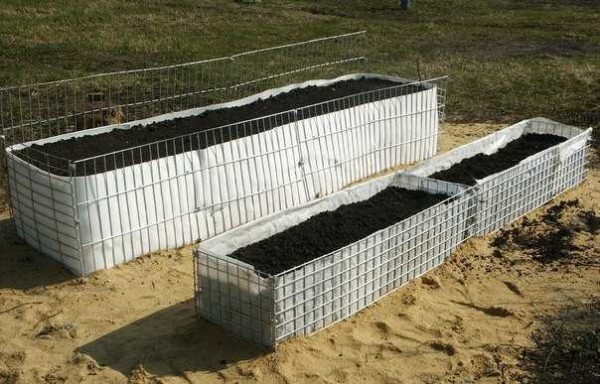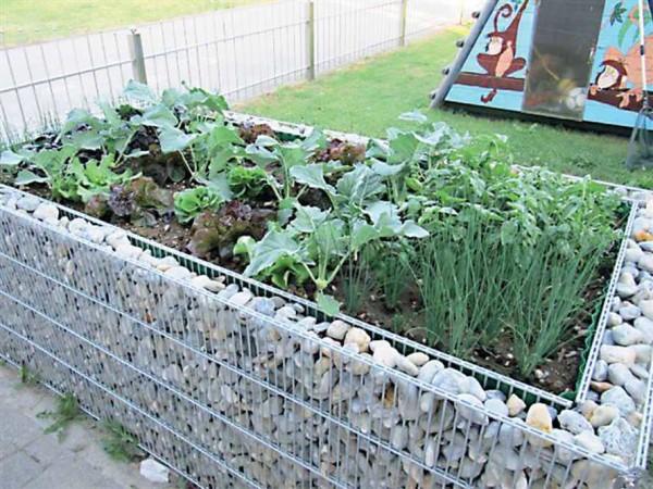 Сетки могут стать основой для гальки или окатышей. Только в этом случае нужен будет двойной каркас, внутрь которого засыпают камни или какой-другой материал. Такая техника называется «габион» и из нее делают не только ограды для грядок и клумб, но и заборы. Но чтобы из габионных грядок вода не просачивалась сквозь стенки, изнутри короб выстилается плотной пленкой.
