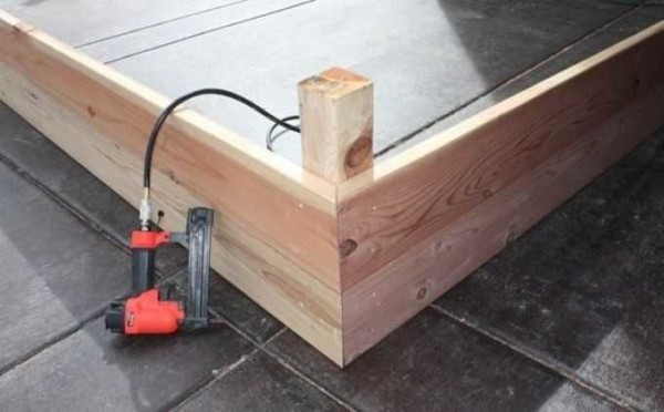 Несколько вариантов того, как можно сделать высокие грядки из досок, были на фото выше. Основная загвоздка обычно в соединении в углах. Проще всего сделать их внахлест: просто приставить одну к другой под 90° и сбить гвоздями насквозь. Но есть эстеты, которые все стремятся сделать правильно. А правильно — запилить две доски под под углом 45° и так их соединить. Именно такой вариант и будет продемонстрирован на фото.