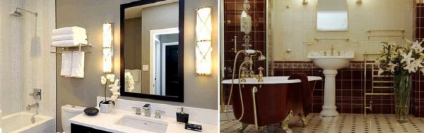 Настенные светильники в ванной комнате устанавливают для подсветки зеркала. Есть несколько вариантов расположения — над зеркалом и с боков. В первом случае высота установки бра определяется тем, как повешено зеркало, во втором — количеством светильников.