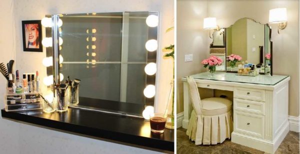 Возле туалетного столика можно много светильников установить или два бра на уровне верхней трети зеркала