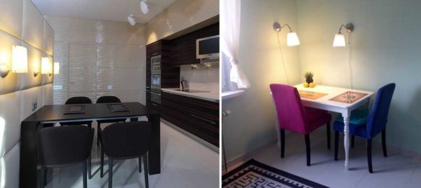 Даже самую небольшую кухню стараются разделить на две зоны — столовую и зону приготовления. Подчеркнуть это размежевание можно освещением и один из способов — повесить рядом с обеденным столом пару настенных светильников. Они, как известно, создают более приватную атмосферу.