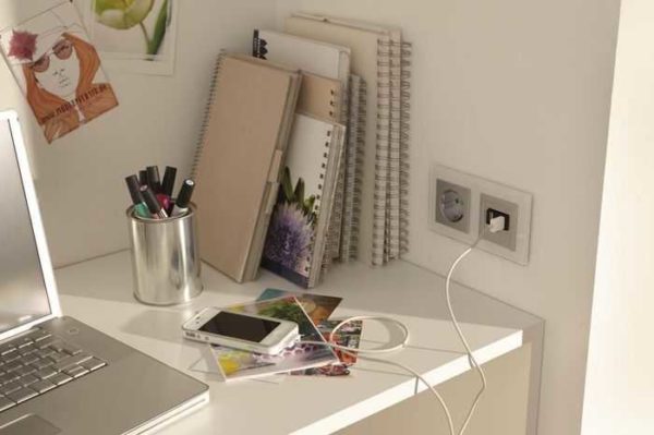 Но не все точки электропитания в комнатах нужно так устанавливать. Например, если возле рабочего стола высота розеток от пола 40 см или около того, каждый раз нырять под стол будет очень неудобно. В таком месте их лучше поставить на 10-15 см выше уровня столешницы. Вот это действительно удобно.