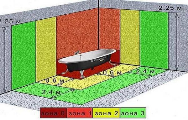 Второе проблемное для электрики помещение — ванная комната. Но проблемы тут другого характера — это повышенная влажность и возможность попадания воды. Чтобы понять, где ставить розетки в ванной, надо знать, где можно размещать бытовые приборы. Помещение ванной делят на зоны (смотрите фото).