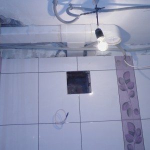 • Как правило, вытяжка в ванную комнату планируется на высоте, делать ее следует под самым потолком. Располагать вытяжку следует напротив дверей, а вот на одной стене с дверным проемом ее планировать не следует.