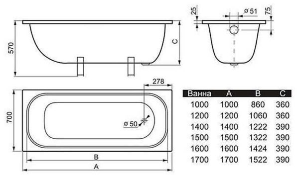 Габариты чугунных ванн