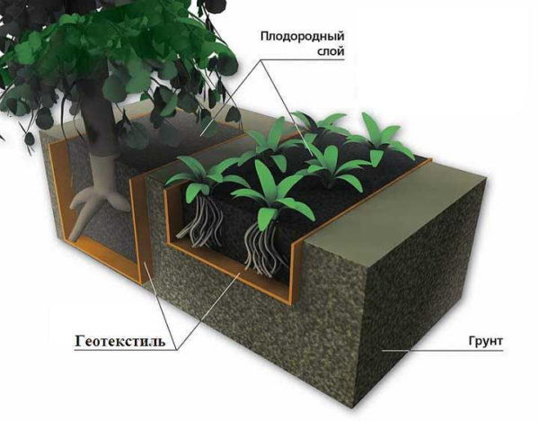 - При формировании клумб и грядок, часто завозят плодородный грунт. Чтобы он не перемешивался с «родной» почвой, слои разделяют этим материалом. Также он будет препятствовать прорастанию корней растений снизу.
