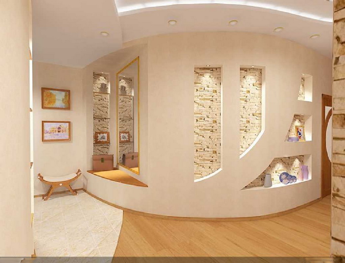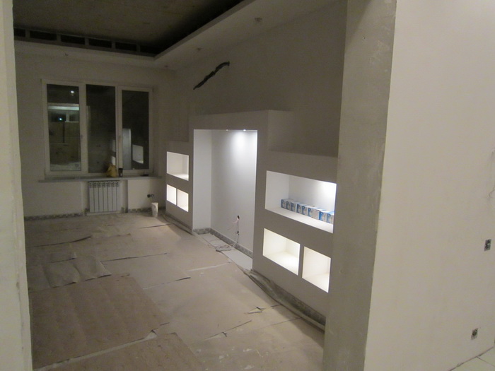 Гипсокартон является очень «пластичным» материалом в руках современных дизайнеров. С помощью гипсокартонных конструкций они возводят не только стены и создают шедевры на потолке, зонируют пространство, выстраивают незаметные системы хранения, открытые книжные полки и стеллажи, ломают стандартную геометрию комнат, делая её более интересной. «Горные разломы», ниши, камины, «волны», колонны – гиспсокартону подвластно всё.