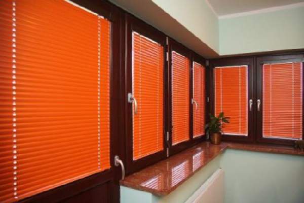 Горизонтальные жалюзи на балконе также довольно уместно использовать. Они хорошо справляются с защитой данного помещения от солнца. Для балкона можно использовать пластиковые горизонтальные жалюзи.