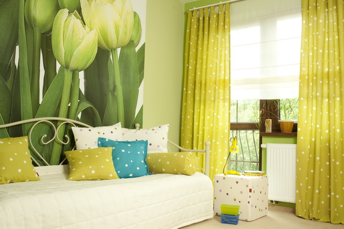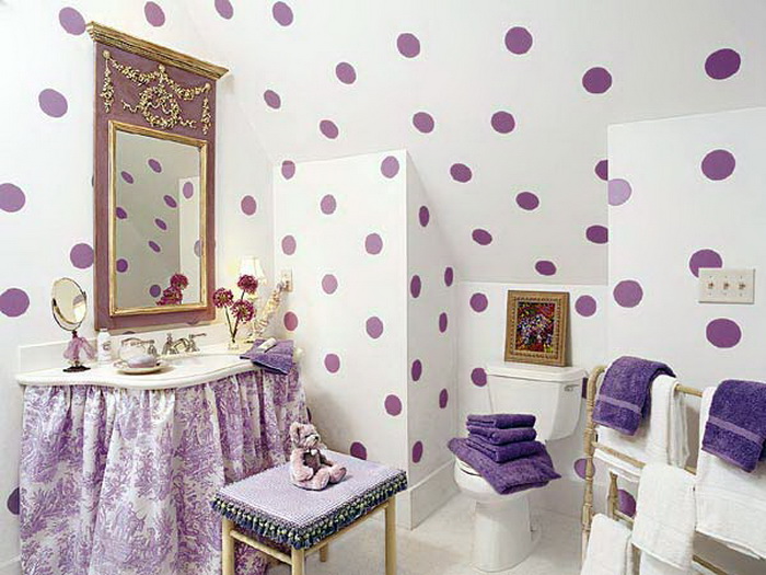 Россыпь горошка может стать украшением любой комнаты – будь то ванная комната, гостиная или детская. От интерьера, отделанного в гороховый принт, веет романтикой и наивностью. Комбинирование крупного и мелкого гороха в отделке стен, благодаря четким линиям, позволяет визуально изменять интерьер. Желательно узор сочетать с однотонным окружением.