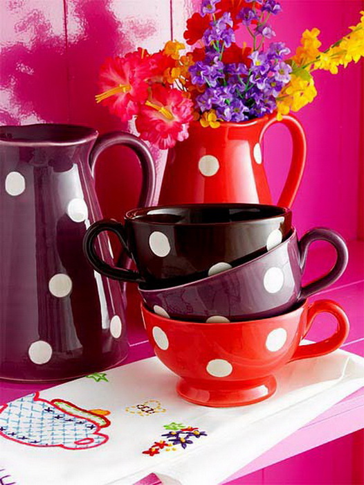 Незамысловатые «гороховые узоры» идеально сочетаются с натуральными материалами – керамикой, деревом, стеклом. От посуды разукрашенной горошком веет добротой и уютом «бабушкиного дома».