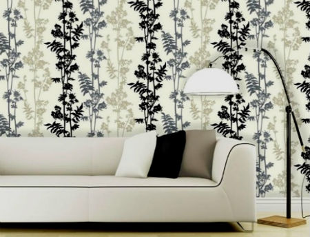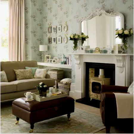 Стены в рассматриваемой гостиной, лучше оклеить обоями, причем предпочтение следует отдать полотнам в цветочек, с различными узорами, а также мелкими изображениями птиц или бабочек. В крайнем случае, если орнамент на обоях не устраивает, то можно оклеить стены, однотонные полотнами, которые затем просто окрасить в понравившийся пастельный оттенок.