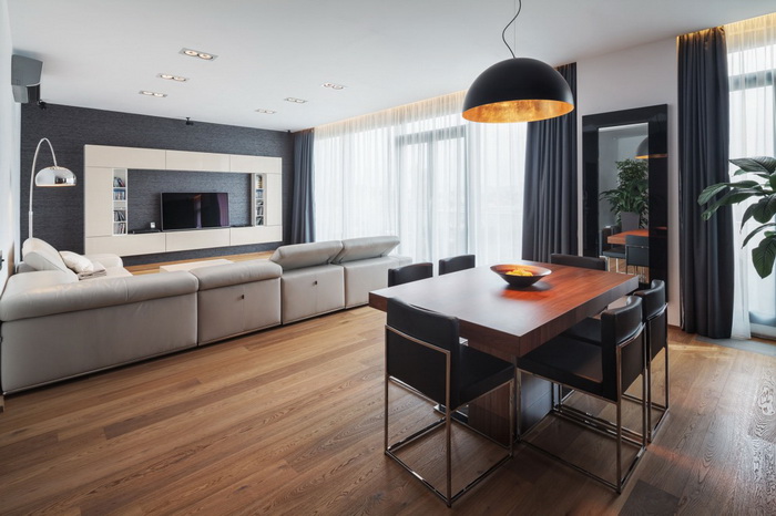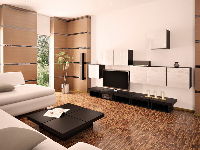 Самым приемлемым материалом, для отделки пола в гостиной является дерево (паркет). Но можно использовать современные материалы: паркетный ламинат или наливные полы.