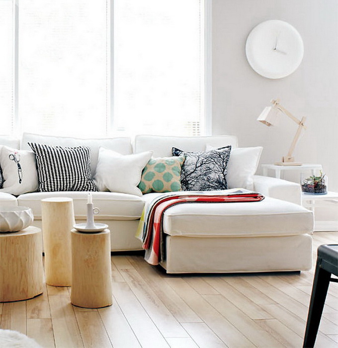 Яркие пятна присутствуют в интерьере гостиной в виде цветных диванных подушек, домотканой дорожки или ковром с ворсом.